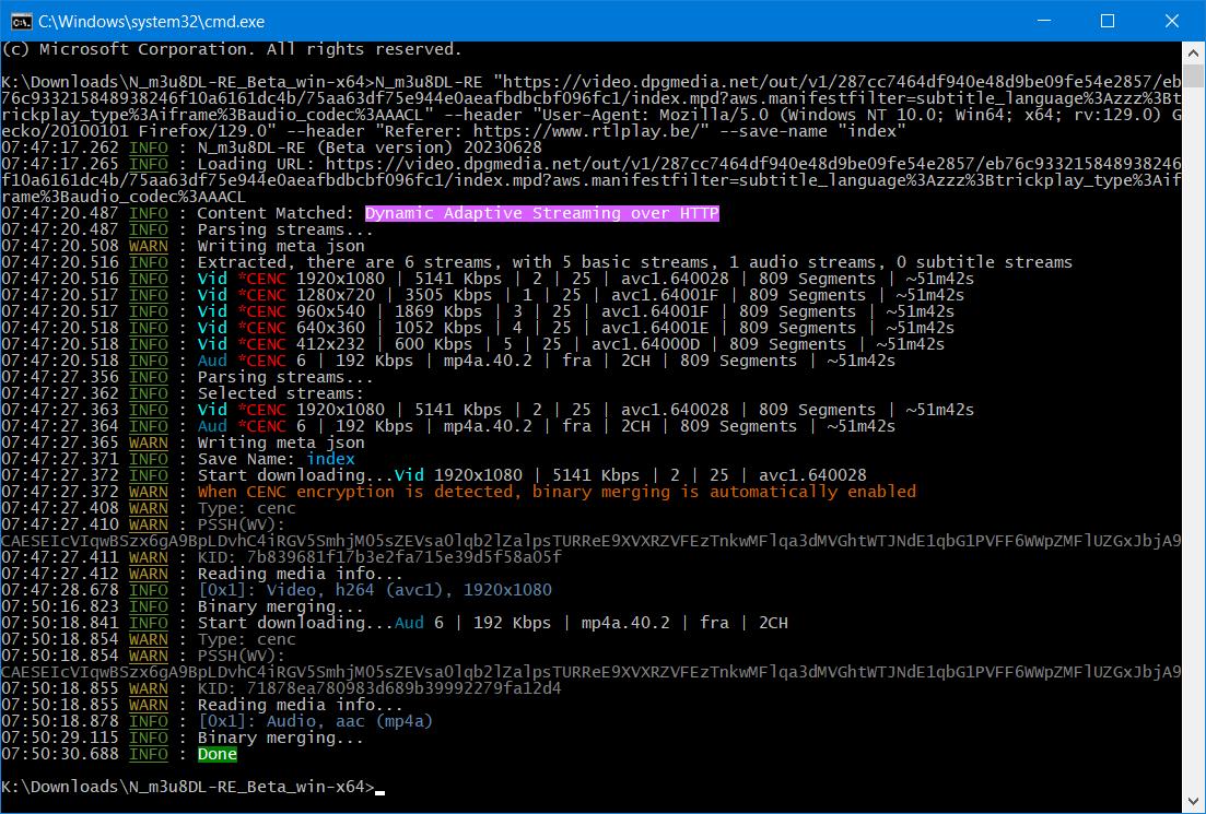 Because the output contains two links:The first one is for the video stream, the second one for subtitles I guess. I was initially pasting the full thing and of course it wasn't working /facepalm.Code:N_m3u8DL-RE "https://video.dpgmedia.net/out/v1/287cc7464df940e48d9be09fe54e2857/eb76c933215848938246f10a6161dc4b/75aa63df75e944e0aeafbdbcbf096fc1/index.mpd?aws.manifestfilter=subtitle_language%3Azzz%3Btrickplay_type%3Aiframe%3Baudio_codec%3AAACL" --header "User-Agent: Mozilla/5.0 (Windows NT 10.0; Win64; x64; rv:129.0) Gecko/20100101 Firefox/129.0" --header "Referer: https://www.rtlplay.be/" --save-name "index" N_m3u8DL-RE "https://video-scrub-images.persgroep.be/eca534ca-dc2a-46eb-b55d-6c07b917a7bc/sprites/eca534ca-dc2a-46eb-b55d-6c07b917a7bc.vtt" --header "User-Agent: Mozilla/5.0 (Windows NT 10.0; Win64; x64; rv:129.0) Gecko/20100101 Firefox/129.0" --header "Referer: https://www.rtlplay.be/" --save-name "eca534ca-dc2a-46eb-b55d-6c07b917a7bc"