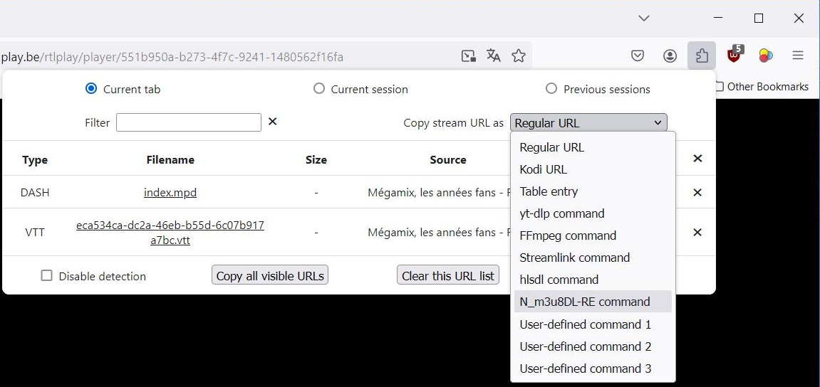 With the Stream Detector, simply selected N_m3u8DL-RE command, then clicked on the index.mpd to save the links.