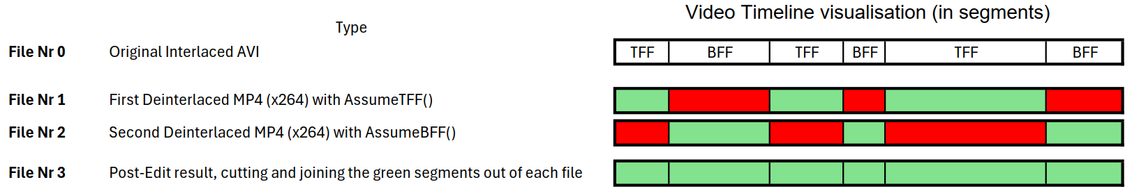 Bellow, a visual representation of my idea. Green represents "properly deinterlaced segments", red the opposite: