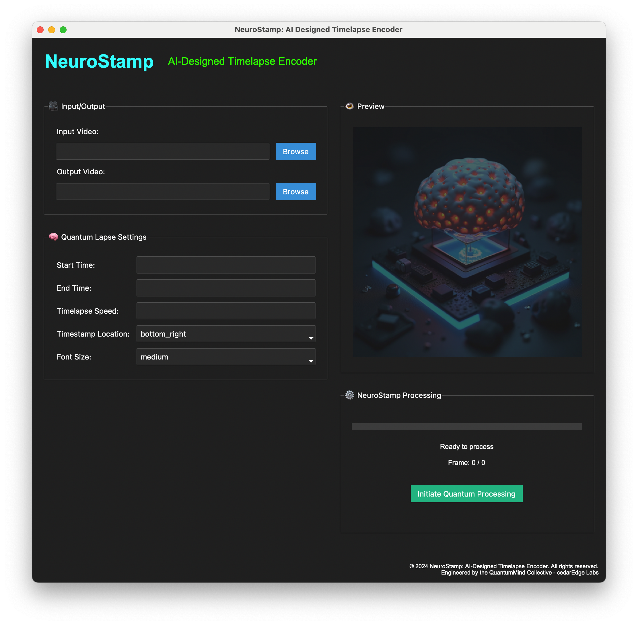 [Attachment 81706 - Click to enlarge] NeuroStamp Timestamp adds an accurate timestamp to videos. Auto calculates start/stop times and sets correct time-lapse speed. User can select timestamp placement and size.