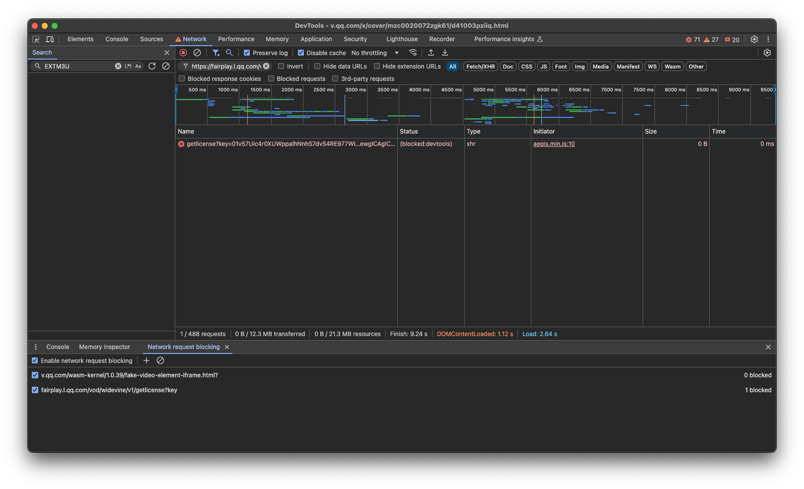 This website doesn't even use widevine license. Content is obtained via : https://h5vv6.video.qq.com/getvinfo which is encrypted (base64 + encryption) (m3u8 is in raw here, that is why you can't find it in network tab). Try to look at : e.onGetInfoOver = function(t)