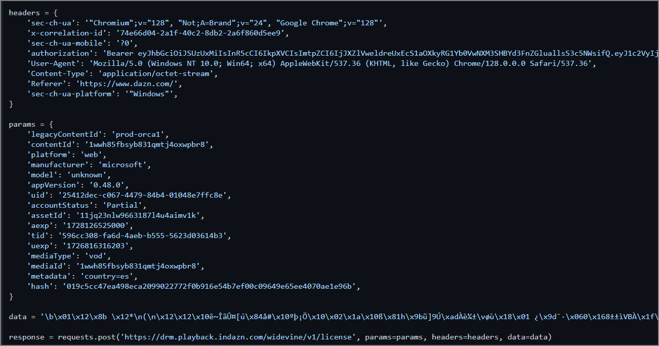 I've got PSSHFrom curlconverter, I've got this from license request:Code:AAAAMnBzc2gAAAAA7e+LqXnWSs6jyCfc1R0h7QAAABISEOp+zuPbpFv6hOUjELr+odY=