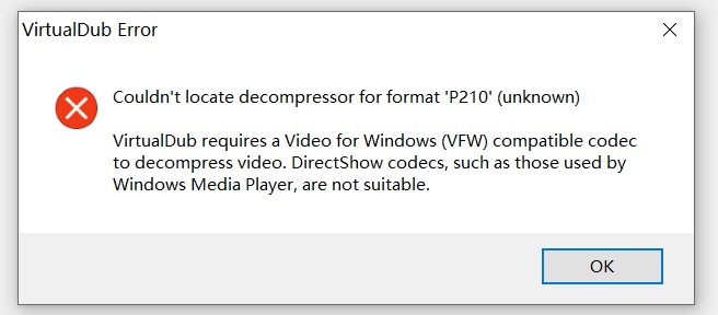 7. That's a VirtualDub error, not an AviSynth error. Specify a colorspace that your version of VirtualDub supports. Or ConvertFormat() and CovnertBits() after ffms2().