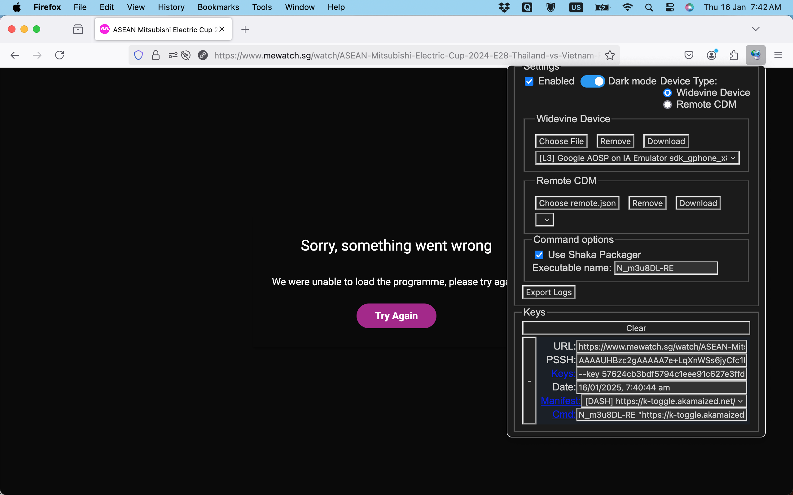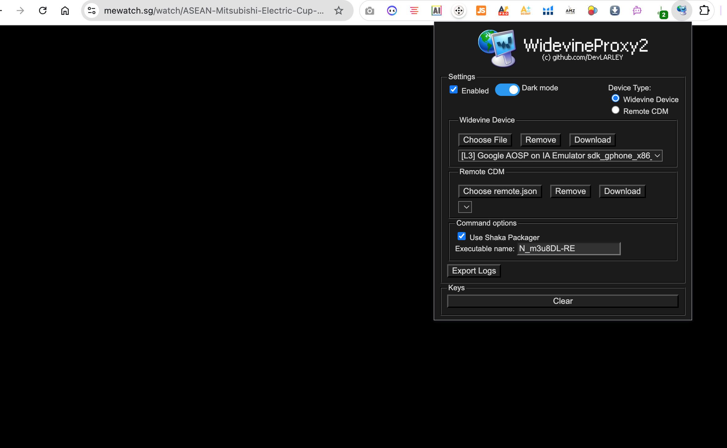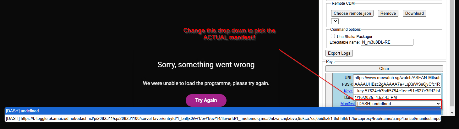 In the picture you posted u have selected remote cdm instead of widevine device in device type sectionCode:N_m3u8DL-RE "https://k-toggle.akamaized.net/edashncl/p/2082311/sp/208231100/serveFlavor/entryId/1_l1jvccf7/v/1/pv/1/ev/14/flavorId/1_,2n16lpr5,nxdns3sc,flytu2km,sp045epw,uasgurid,jtb8jwo1,/forceproxy/true/name/a.mp4.urlset/manifest.mpd" --key d4408b714fc78acfeee4a5b8822b94c9:9b9c86688ea26b5154e88d96e2dbee2b --use-shaka-packager -M format=mkv