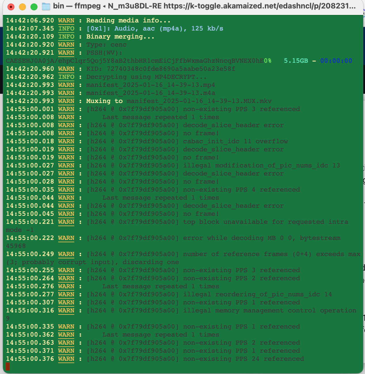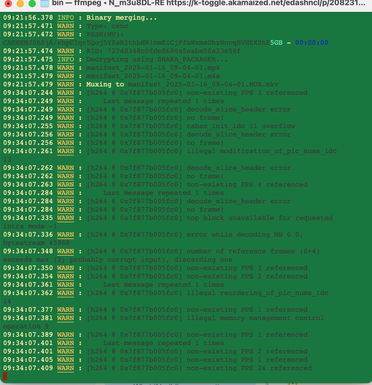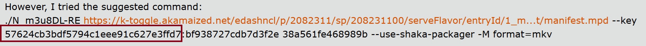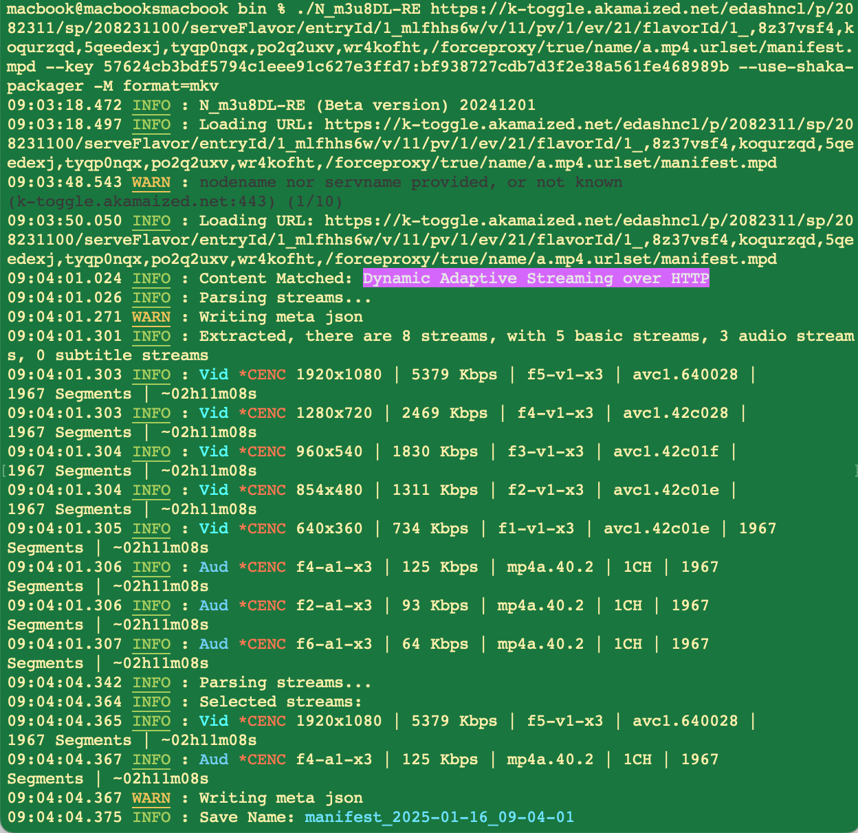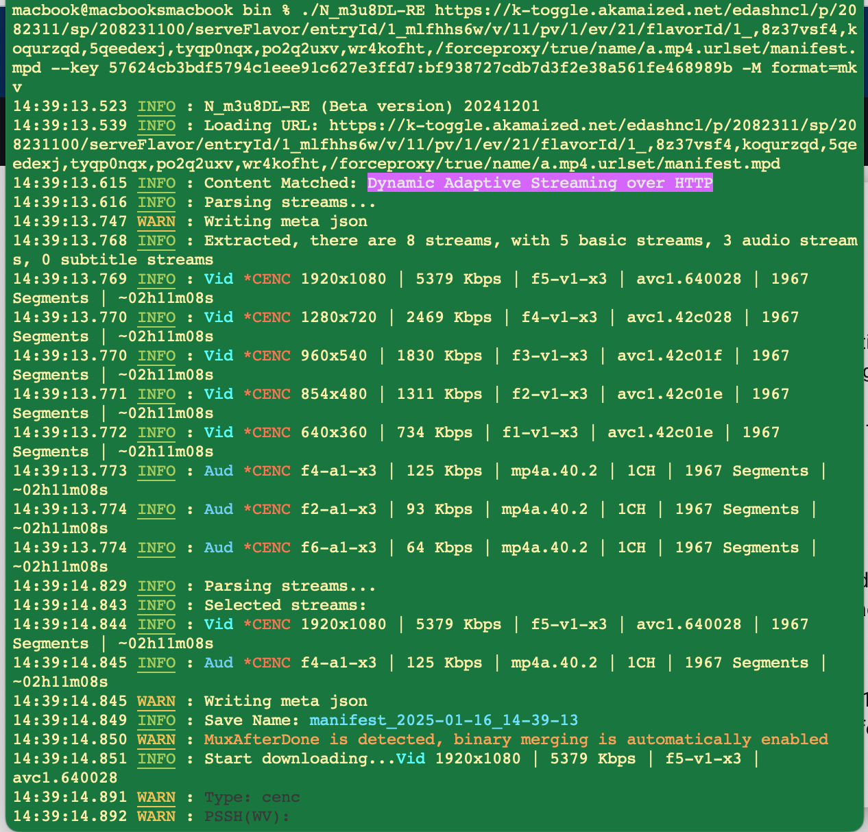 ./N_m3u8DL-RE https://k-toggle.akamaized.net/edashncl/p/2082311/sp/208231100/serveFlavor/entryId/1_m...t/manifest.mpd --key 57624cb3bdf5794c1eee91c627e3ffd7:bf938727cdb7d3f2e 38a561fe468989b --use-shaka-packager -M format=mkv