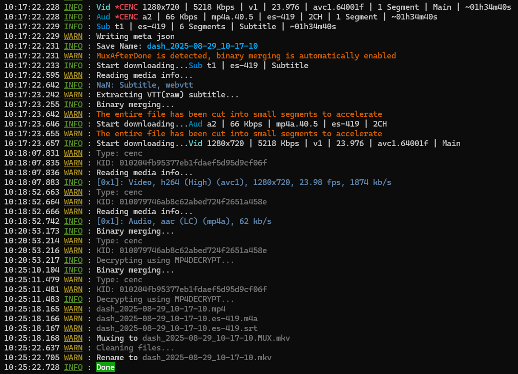 N_m3u8DL-RE "https://cf.prd.media.h264.io/69f8d21e-fce4-4ecd-a586-8427558919d7/dash.mpd?manifest-params=r1%7CjgHVTiJIp4w-q0sZZVppvvEFOHn-ZmCjnlM_Da_LbUc%3D%7CZi5hdWRpb0NvZGVjPWhlYWFjJmYuYXVkaW9UcmFjaz1lbi1VUyU3Q3Byb2dyYW0mZi5hdWRpb1RyYWNrPWVzLTQxOSU3Q3Byb2dyYW0mZi5tZXJnZVBlcmlvZHM9dHJ1ZSZmLnRleHRUcmFjaz1lbi1VUyZmLnRleHRUcmFjaz1lcy00MTkmZi52aWRlb0NvZGVjPWF2YyZmLnZpZGVvRHluYW1pY1JhbmdlPXNkciZmLnZpZGVvTWF4SGVpZ2h0PTEwODAmZi52aWRlb01heFdpZHRoPTE5MjAmci5kdXJhdGlvbj00LjAwNDAwMCZyLmR1cmF0aW9uPTU2ODAuOTY2OTU4JnIua2V5bW9kPTImci5tYWluPTEmci5tYW5pZmVzdD00MTIwY2YzMi0wZWNkLTRiYjQtODA2MC0wOTMyZDRlNWUxYmQlMkYwXzRjYmFiOC5tcGQlN0NwcmQtd2JkLWFtZXItY3JlYXRpdmVzJTdDaHR0cHMlM0ElMkYlMkZjZi5hbWVyLWZyZWUucHJkLm1lZGlhLm1heC5jb20lMkZhbWVyJTJGNDEyMGNmMzItMGVjZC00YmI0LTgwNjAtMDkzMmQ0ZTVlMWJkJnIubWFuaWZlc3Q9NjlmOGQyMWUtZmNlNC00ZWNkLWE1ODYtODQyNzU1ODkxOWQ3JTJGNl84ZTFhODEubXBkJTdDcHJkLXdiZC1hbWVyLXZvZA%3D%3D&rtype=r&x-wbd-tenant=beam&x-wbd-user-home-market=amer" -H "User-Agent: Mozilla/5.0 (Windows NT 10.0; Win64; x64) AppleWebKit/537.36 (KHTML, like Gecko) Chrome/139.0.0.0 Safari/537.36" -H "Accept: */*" -H "Origin: https://play.hbomax.com" -H "Referer: https://play.hbomax.com/" --key 010079746ab8c62abed724f2651a458e:9f79517bdca6d37a45576ca6d9e8f439 --key 0101019c3a4f71a1b1bd44bc8a6eaef6:1678f20f18a3851aa3ed10a47fa95e00 --key 010204fb95377eb1fdaef5d95d9cf06f:036d3417582d97f8eebc02e72d69e42b --key 01052e9e07897539d5bdf47e199ed415:00000000000000000000000000000000 -M format=mkv