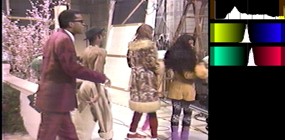 I'm capturing VHS footage with a JVC S-VHS HR-S3900U hooked up via S-Video to a Panasonic DMR-ES10 for TBC going into an ATI TV Wonder USB 600. I'm using VirtualDub to capture in HuffyYUV with sharpness set to 0, and I learned how to set the crop settings to avoid overscan so that I could adjust the brightness and contrast to eliminate red on the left and right side of the histogram.