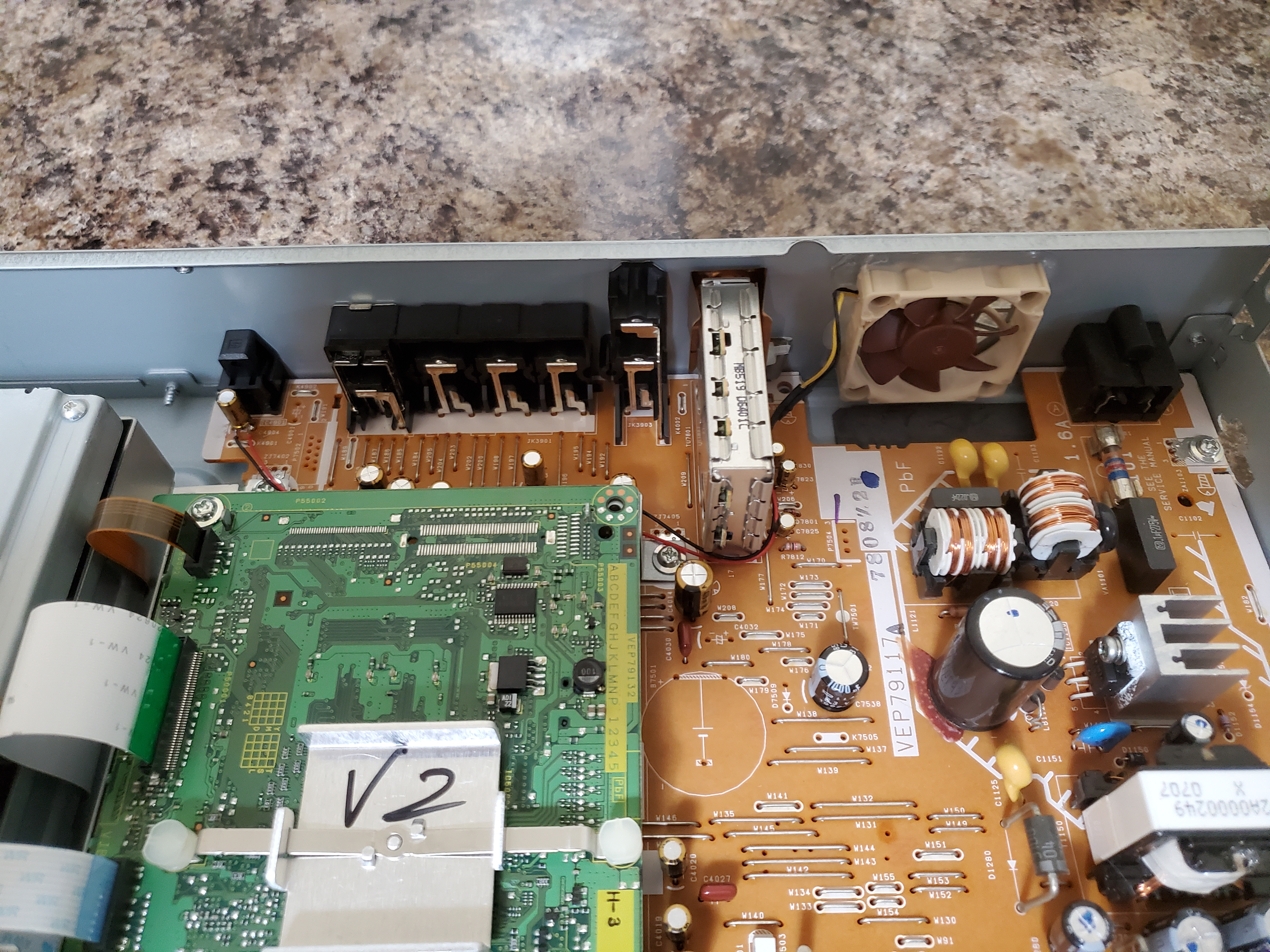 Usually pulling the board isn't an issue for me, as I used to modify D!shnet satellite boxes. (Well.. I converted Bell XPressVu into D!shnet... same parent company, so models were basically the same boards). I originally wanted to drill and screw mount the fan, but wasn't sure how involved pulling the board would be. But after lifting the green board, there's not much more to it, except for the front panel and DVD tray. I can pull the board, remove the front panel, then tape and wrap the drive with a plastic bag. Unless it comes out just as easily. Even if it doesn't have vias connected with the pin holes, I'll look for a temporary source that terminates upon shutdown. The cap I'm using now wasn't powered when the unit was plugged in, only once it was powered on... then stays on after powerdown.