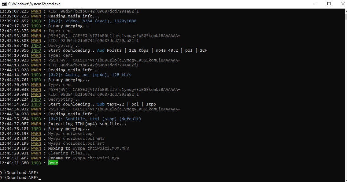 Code:ffmpeg -i decrypted_audio.m4a -i decrypted_video.mp4 -c:v copy -c:a copy -y -loglevel error output_filename.mp4