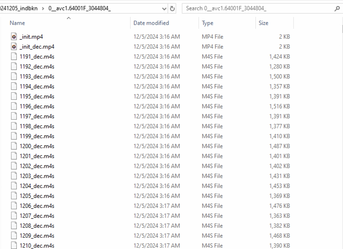 However, .ms4 file id's at video segments folder(1_mp4a.40.5-104400-48000-2___en) are not consistent. Some of them are not decoded(I assume _dec is the abbreviation for "decoded"). Also, it seems like some of the files are decoded twice???(files that end with "_dec_dec")