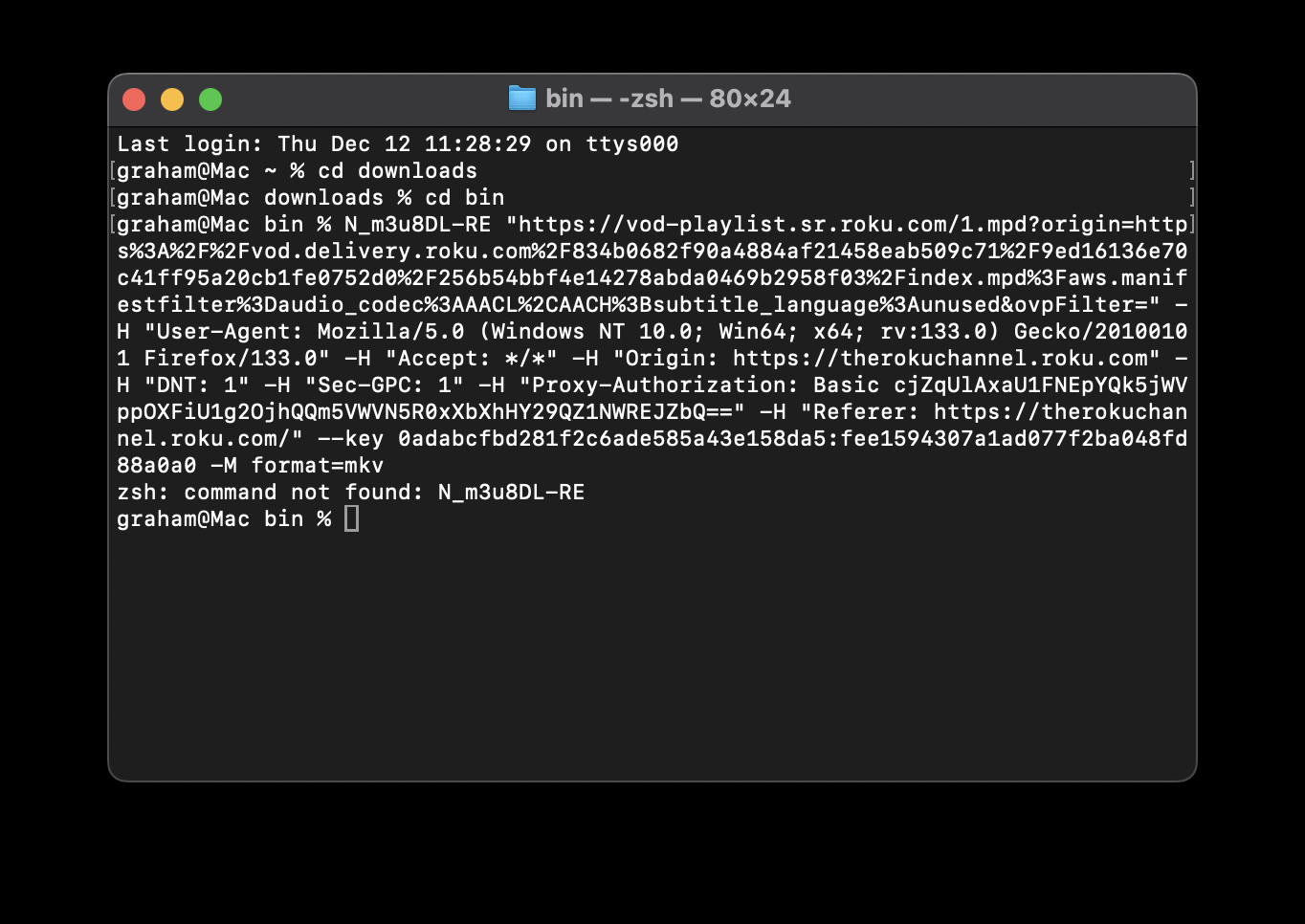 Put the files: ffmpeg, n_m3u8dl-re and mp4decrypt all in one folder (of your choice). Then open mac terminal in that folder and use the commands that @silver provided--[----->+<]>.++++++++++++.---.--------.