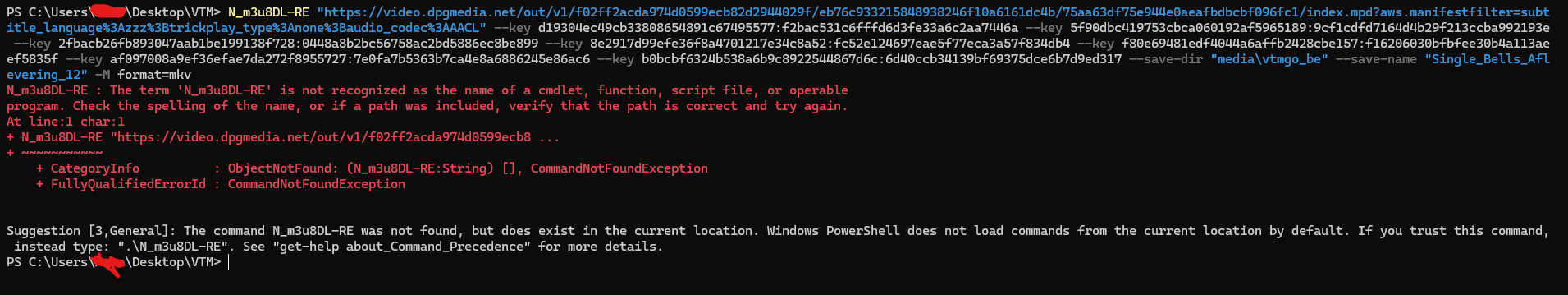 Go in the ffmpeg and bento folder and look for ffmpeg.exe and mp4decrypt.exe (look for folder in folder if needed) and place them near N_m3u8DL-RE exe that you already have. Then open CMD not powershell. Or if you prefer powershell append .\ to the beginning of the command