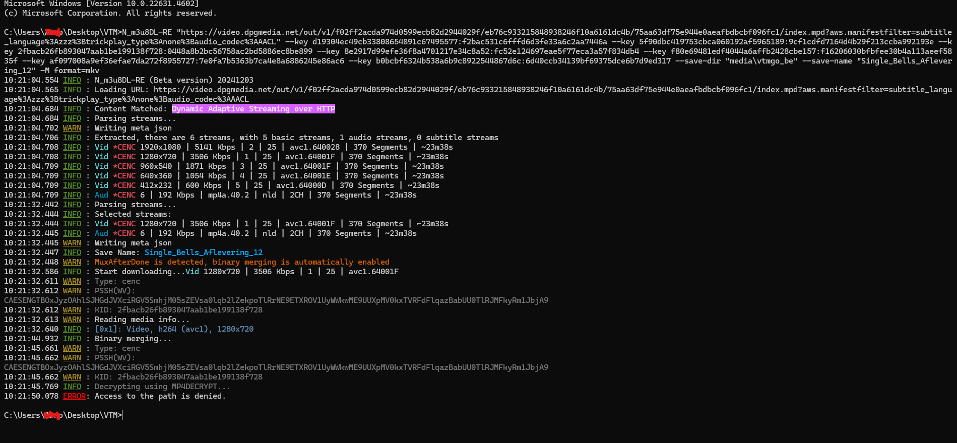 N_m3u8DL-RE "https://video.dpgmedia.net/out/v1/f02ff2acda974d0599ecb82d2944029f/eb76c933215848938246f10a6161dc4b/75aa63df75e944e0aeafbdbcbf096fc1/index.mpd?aws.manifestfilter=subtitle_language%3Azzz%3Btrickplay_type%3Anone%3Baudio_codec%3AAACL" --key d19304ec49cb33808654891c67495577:f2bac531c6fffd6d3fe33a6c2aa7446a --key 5f90dbc419753cbca060192af5965189:9cf1cdfd7164d4b29f213ccba992193e --key 2fbacb26fb893047aab1be199138f728:0448a8b2bc56758ac2bd5886ec8be899 --key 8e2917d99efe36f8a4701217e34c8a52:fc52e124697eae5f77eca3a57f834db4 --key f80e69481edf4044a6affb2428cbe157:f16206030bfbfee30b4a113aeef5835f --key af097008a9ef36efae7da272f8955727:7e0fa7b5363b7ca4e8a6886245e86ac6 --key b0bcbf6324b538a6b9c8922544867d6c:6d40ccb34139bf69375dce6b7d9ed317 --save-dir "media\vtmgo_be" --save-name "Single_Bells_Aflevering_12" -M format=mkv