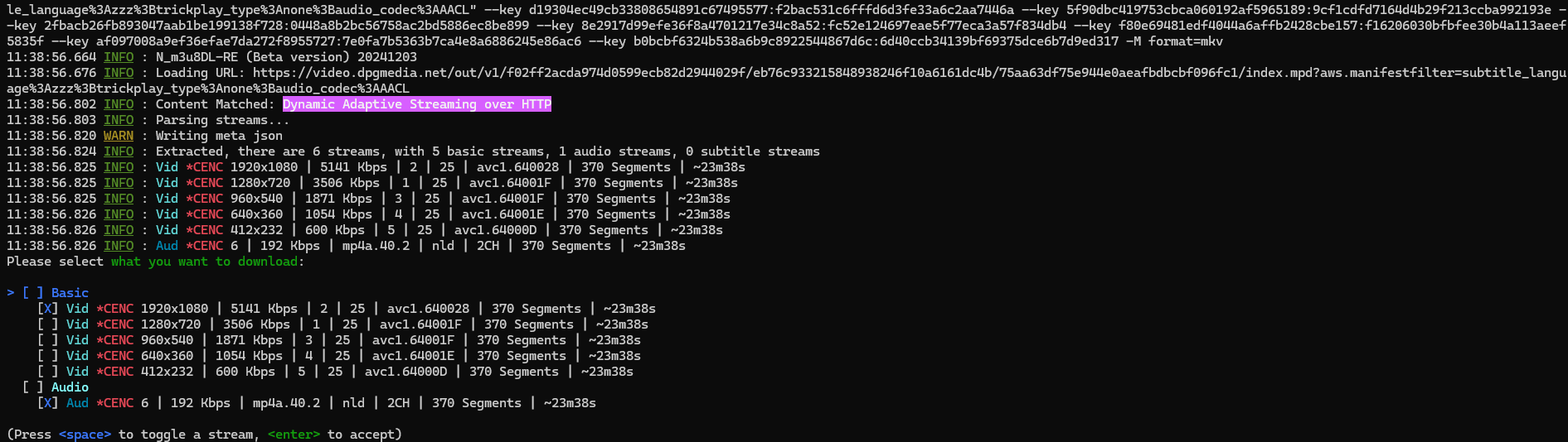 N_m3u8DL-RE "https://video.dpgmedia.net/out/v1/f02ff2acda974d0599ecb82d2944029f/eb76c933215848938246f10a6161dc4b/75aa63df75e944e0aeafbdbcbf096fc1/index.mpd?aws.manifestfilter=subtitle_language%3Azzz%3Btrickplay_type%3Anone%3Baudio_codec%3AAACL" --key d19304ec49cb33808654891c67495577:f2bac531c6fffd6d3fe33a6c2aa7446a --key 5f90dbc419753cbca060192af5965189:9cf1cdfd7164d4b29f213ccba992193e --key 2fbacb26fb893047aab1be199138f728:0448a8b2bc56758ac2bd5886ec8be899 --key 8e2917d99efe36f8a4701217e34c8a52:fc52e124697eae5f77eca3a57f834db4 --key f80e69481edf4044a6affb2428cbe157:f16206030bfbfee30b4a113aeef5835f --key af097008a9ef36efae7da272f8955727:7e0fa7b5363b7ca4e8a6886245e86ac6 --key b0bcbf6324b538a6b9c8922544867d6c:6d40ccb34139bf69375dce6b7d9ed317 -M format=mkv