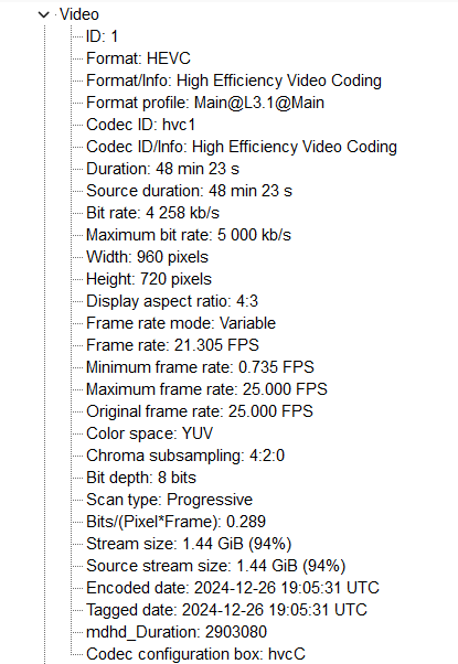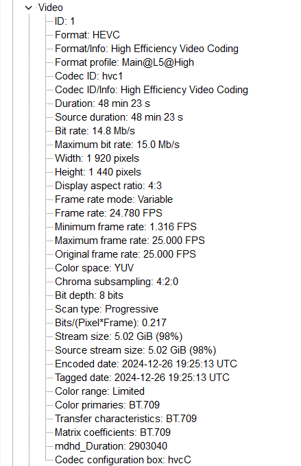 On the right side I click "Advanced Features" then "Remove Duplicate Frames". I tried this approach with three different versions of one source material. First with raw quality (720x576p interlaced in MPEG 2), second filtered, deinterlaced and upscaled to 720p with Topaz Video in MKV FFV1 8-bit 4:4:4, and third filtered and upscaled to 1440p in MP4 HEVC. The processing speed on the raw material was fastest (500fps approximately), on the second one slightly less (300-400fps), on the third significantly slower (120fps). On the all processed files I don't see differences. At the metadata the results are also pretty similar but something that I do not expected is that the framerate is not 24fps what I expected but varries. Here are screenshots of the Media Info analyze in the same order, exept the first one. I will explain later why I missed it.