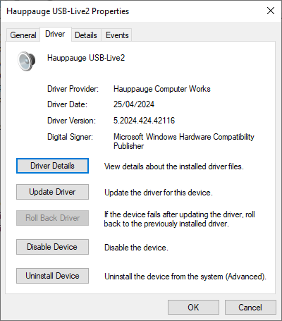 In general, what comes with the generic software Hauppauge Capture or WinTV may contain wrong/old/too new drivers.