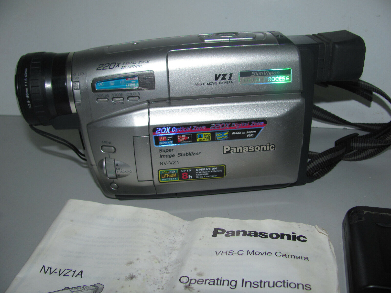 "Old vintage retro silver Panasonic NV-VZ1A vhs-c analogue film cassette video camera. Seems to work ok (records, plays with good sound, colour lcd screen and black and white viewfinder both works etc), but makes loud buzzing noise when working. Needs a service.