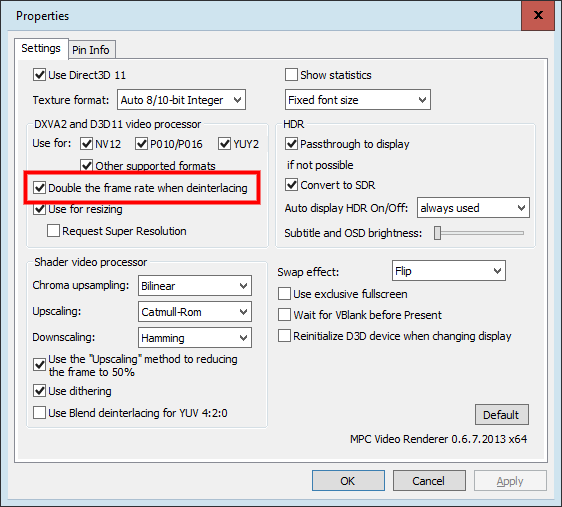 I don't have the "MPC Video Renderer" options you showed and it isn't even in the selectable list. I did however get it to play at 29.970fps in the LAV settings by turning off the hardware acceleration and leaving the deinterlacing mode to auto. I was setting the deinterlacing mode to disabled before, which is why the software deinterlacer was having no effect. I thought it was tied with hardware settings.