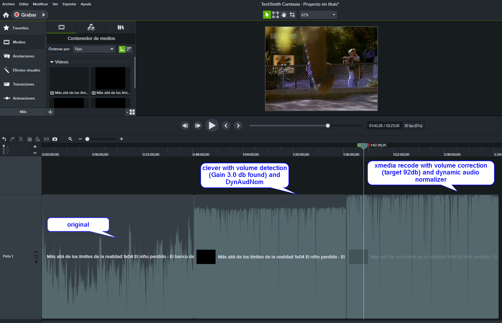 I will try to explain it with an example: imagine a video with low sound, I analyze it with Xmedia Recode and it is around 60db. I apply volume correction to 92db, but applying "Dynamic audio normalizer" I see that it does not reach 92db because it also flattens/reduces the high sounds and it would no longer reach 92db.
