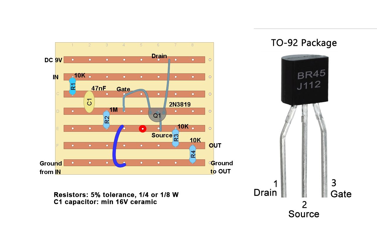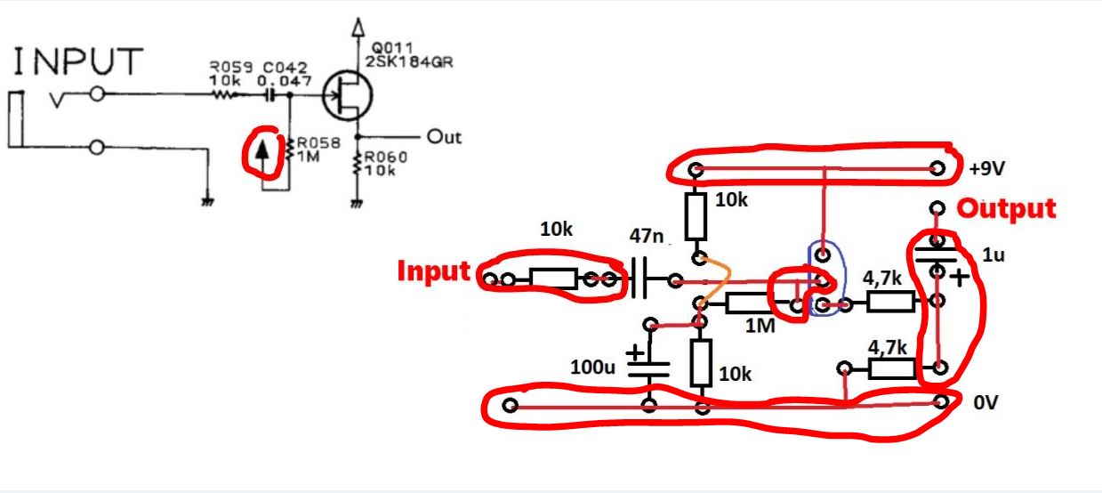 Besides if you link guides, I don't mind. But the problem is, I noticed most guides assume you have a basic knowledge of electronics, and they don't describe stuff that those people who have no clue about electronics don't know. However, I noticed the essential things needed to convert the block diagram to stripboard design is knowing how the routing situations look on the stripboards. Now that is what most guides don't really show one by one, that information is scattered among lots of different guides. So, if you know any guide that focuses on the routing situations only and shows how the different ones look on the stripboard, that kind of guide would be very useful for me. For example, here are 2 other circuits on this image. I encircled the routing situations that I would like to see how they look on the stripnboard. If I could see them, I could already start converting simple block diagrams myself: