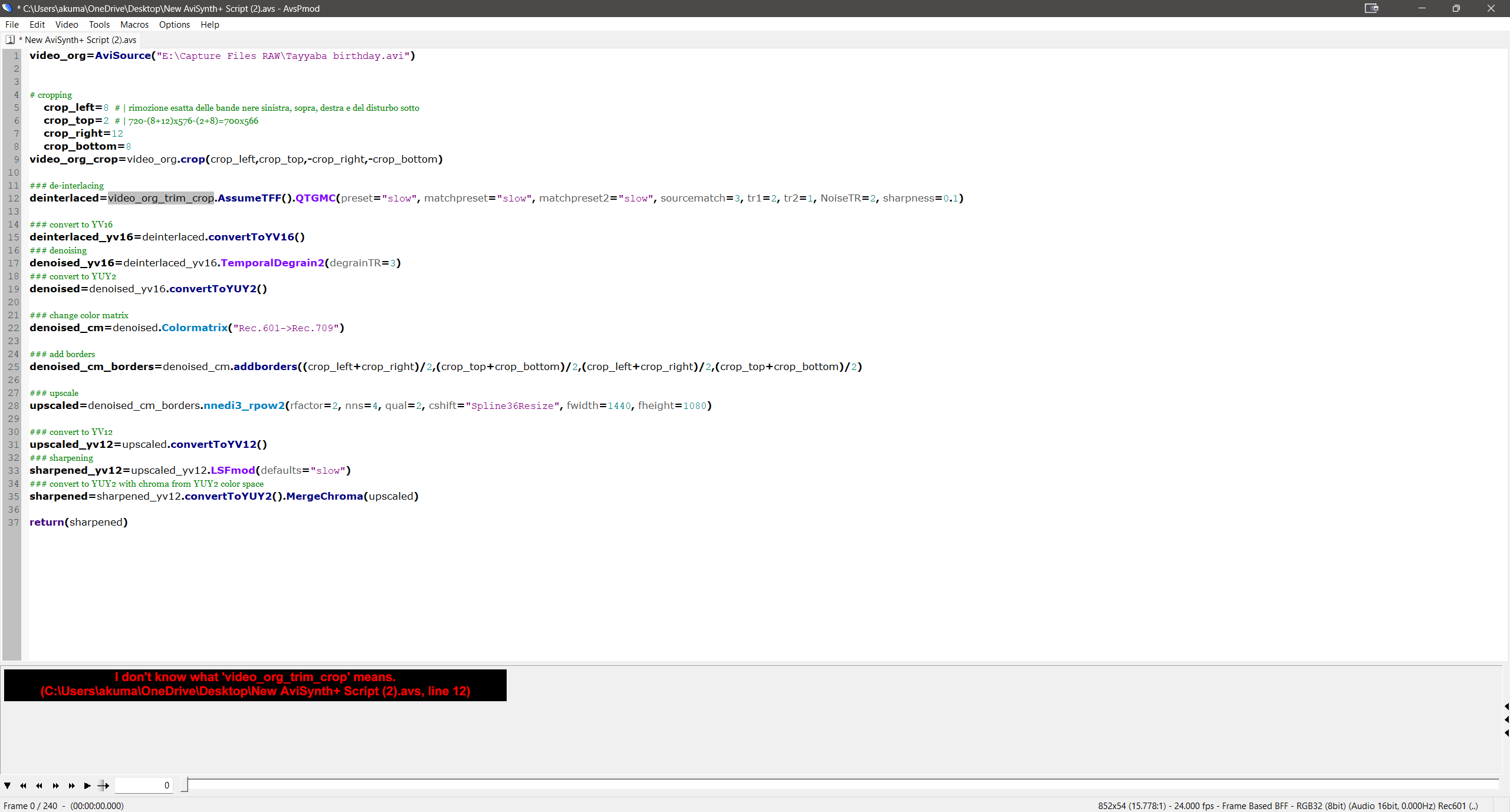 load it in VirtualDub or AvsPMod for display and feed it to ffmpeg for a distribution format like h264, or just output to original HuffYUV from VirtualDub.Code:video_org=AviSource("test clip.avi") # cropping crop_left=8 # | rimozione esatta delle bande nere sinistra, sopra, destra e del disturbo sotto crop_top=2 # | 720-(8+12)x576-(2+8)=700x566 crop_right=12 crop_bottom=8 video_org_crop=video_org.crop(crop_left,crop_top,-crop_right,-crop_bottom) ### de-interlacing deinterlaced=video_org_crop.AssumeTFF().QTGMC(preset="slow", matchpreset="slow", matchpreset2="slow", sourcematch=3, tr1=2, tr2=1, NoiseTR=2, sharpness=0.1) ### convert to YV16 deinterlaced_yv16=deinterlaced.convertToYV16() ### denoising denoised_yv16=deinterlaced_yv16.TemporalDegrain2(degrainTR=3) ### convert to YUY2 denoised=denoised_yv16.convertToYUY2() ### change color matrix denoised_cm=denoised.Colormatrix("Rec.601->Rec.709") ### add borders denoised_cm_borders=denoised_cm.addborders((crop_left+crop_right)/2,(crop_top+crop_bottom)/2,(crop_left+crop_right)/2,(crop_top+crop_bottom)/2) ### upscale upscaled=denoised_cm_borders.nnedi3_rpow2(rfactor=2, nns=4, qual=2, cshift="Spline36Resize", fwidth=1440, fheight=1080) ### convert to YV12 upscaled_yv12=upscaled.convertToYV12() ### sharpening sharpened_yv12=upscaled_yv12.LSFmod(defaults="slow") ### convert to YUY2 with chroma from YUY2 color space sharpened=sharpened_yv12.convertToYUY2().MergeChroma(upscaled) return(sharpened) -