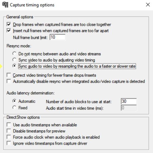With modern OSs and modern cards VirtualDub shows sometime a/v synch problem, even with no dropped frames and external frame TBC in the signal path. An example here: https://www.digitalfaq.com/forum/video-capture/12986-amarectv-frame-inserts.html (but there are many others)I use VDub 1.9.11 and these settings in Timing, which keeps my audio video in sync
