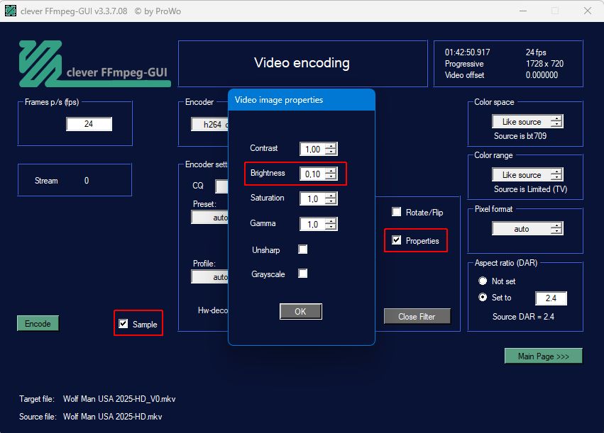 Increase brightness to 0.10 and encode a sample of 60 seconds to see the result.