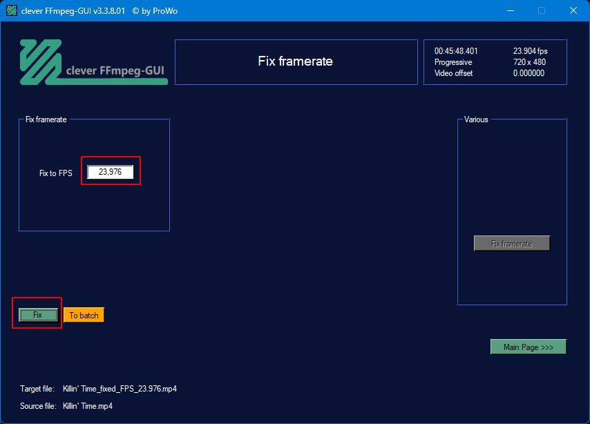 Load your file, click main page, click various, click fix framerate, set 23.976 as framerate and click fix.