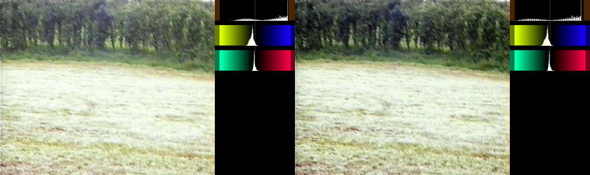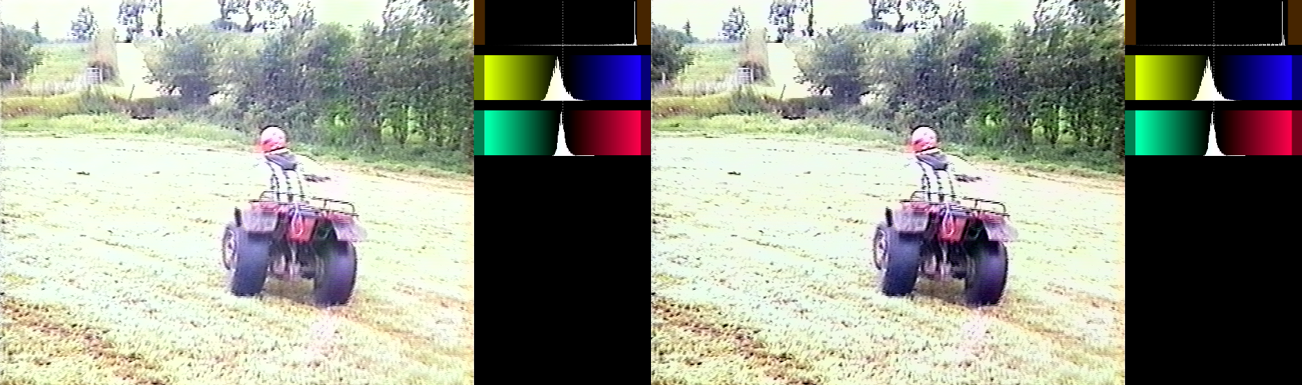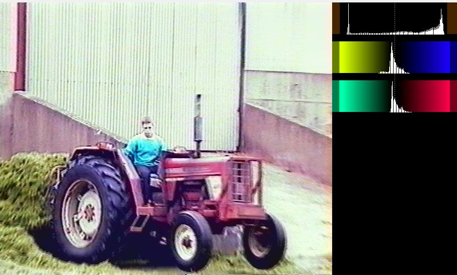 1. I've been capturing this tape (Huffyuv AVI) which seems to be in poor condition. It is likely poor exposure settings on the old camcorder that recorded directly to VHS tape in the mid 90s as other parts of the tape seem better. It seems to get worse when deinterlacing and converting to ProRes so I can import into Resolve. I couldn't make anything decent of it with Resolve colour tools.