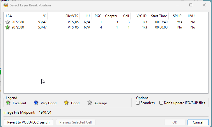 I downloaded and burned a dvd all by myself. Then I downloaded a blu ray movie and tried to burn it and I am stuck again. It downloaded fine. with the same exact size. I started the burn in Test Mode. It said like always Test Mode might not be supported by the current media dvd+r dl Data could be written to the disc would I like to continue? I choose Yes. Then it said: Your disc could still be empty /blank when the write operation has completed. do I want to continue in test mode? I was told before to choose seamless but I also have to choose one of the stars. Any idea which to choose and why? How do you know which to choose? How do I learn so maybe one day I will know how to choose without having to bother you all about it? Thanks! -