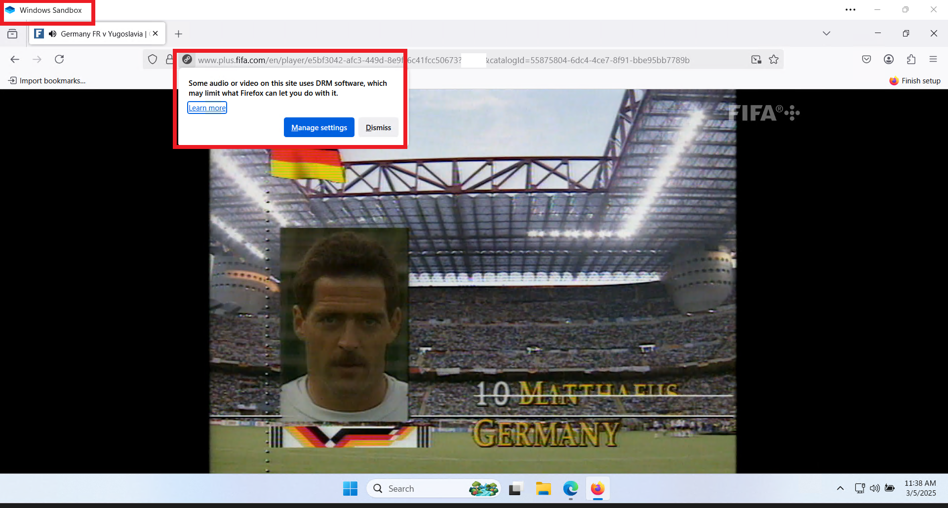 to play the video and then use obs on the host machine. Here'a screenshot playing fifa drm content on a sandbox, so naturally obs works too since even screenshots are blocked on the host machine due to drm