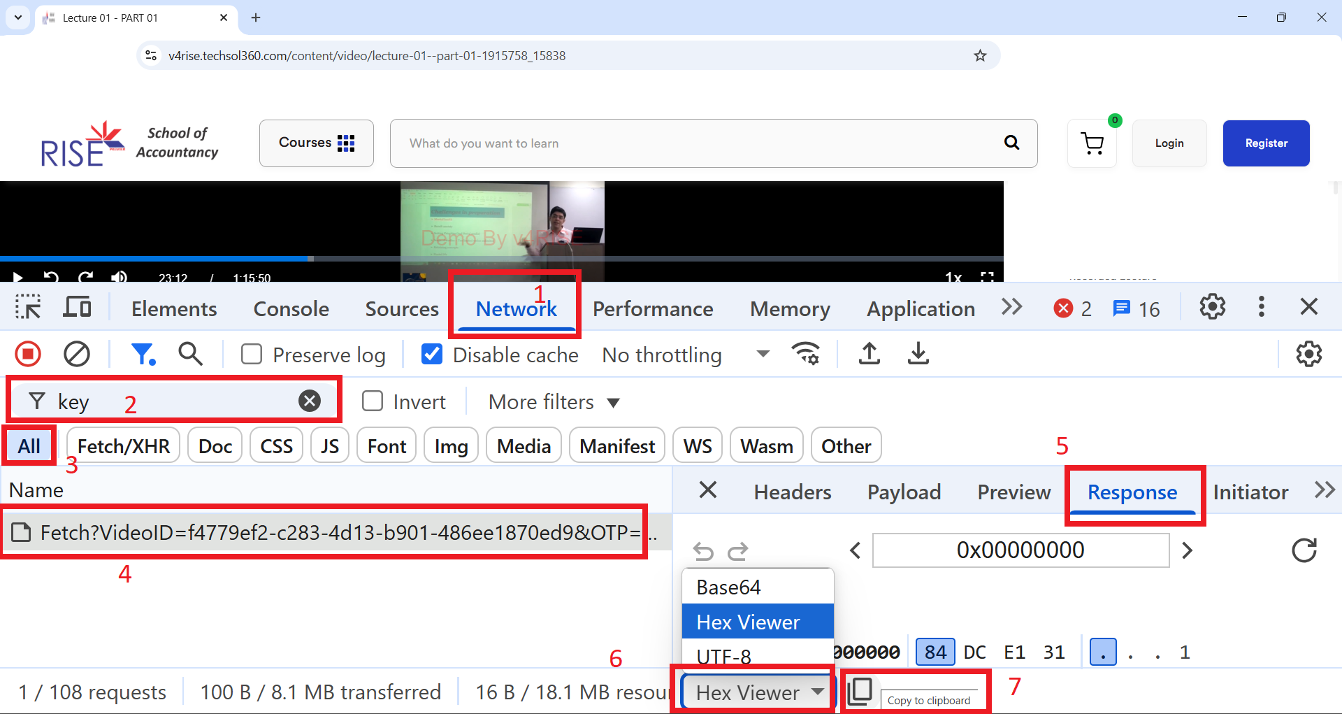 - go back to network requests and filter for "key" > view hex response > copy to clipboard, in this case the value is gonna be