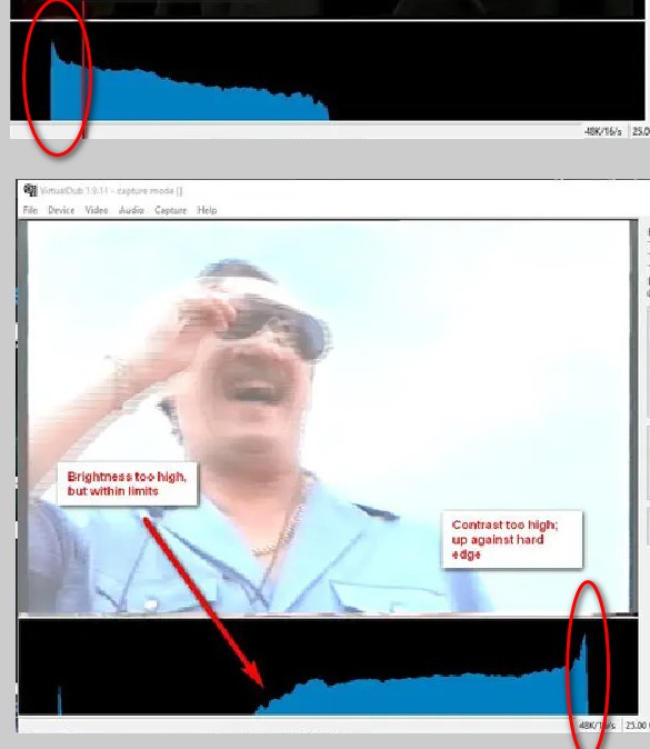 @Lollo, just tried; VDub is still showing a "wall" well inside both the left and right edges of the histogram, even with minimum brightness and maximum contrast.