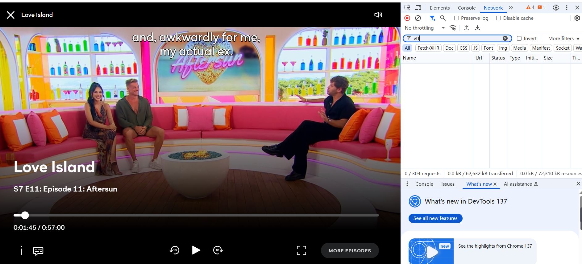 I previously obtained the subtitle files for episodes 2-9 in the developer tools, and they were files ending in webvtt. But when I searched for vtt files again a few days later, nothing was displayed. When I searched for subt files, as shown in the picture, the subtitle size was 0 and there was no content. I don't know what happened? Does anyone know why this is happening? How can I get vtt subtitle files next time? Thanks to everyone who saw this post. The URL is:https://www.peacocktv.com/watch/playback/vod/GMO_00000000251519_02/a08d37a8-9751-372b-...ct&paused=true