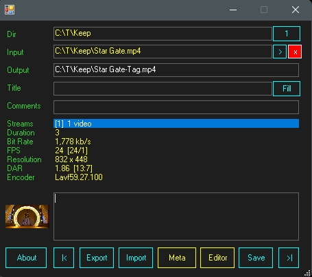 [Title, comments, streams count & types, duration, bit rate, FPS, resolution, DAR, encoded by]