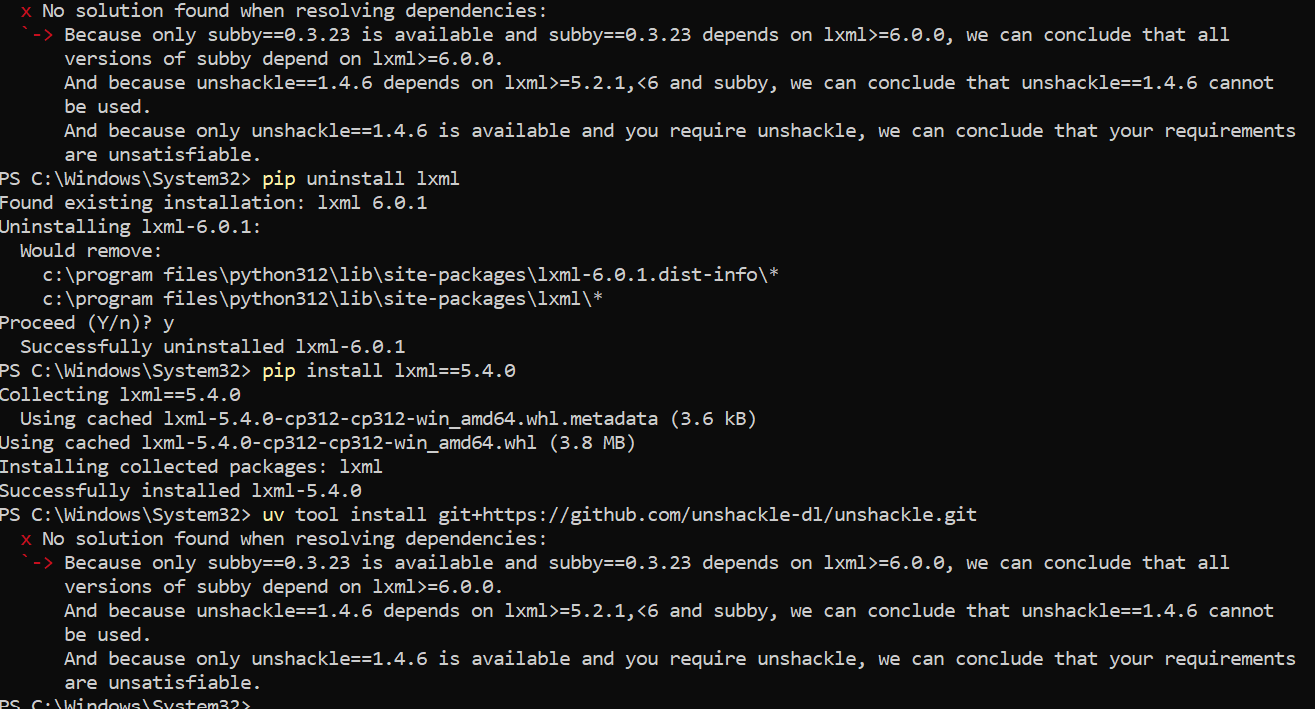 What is going on with the install process. wont let me install via uv. i downgraded subby and lxml but still not allowing