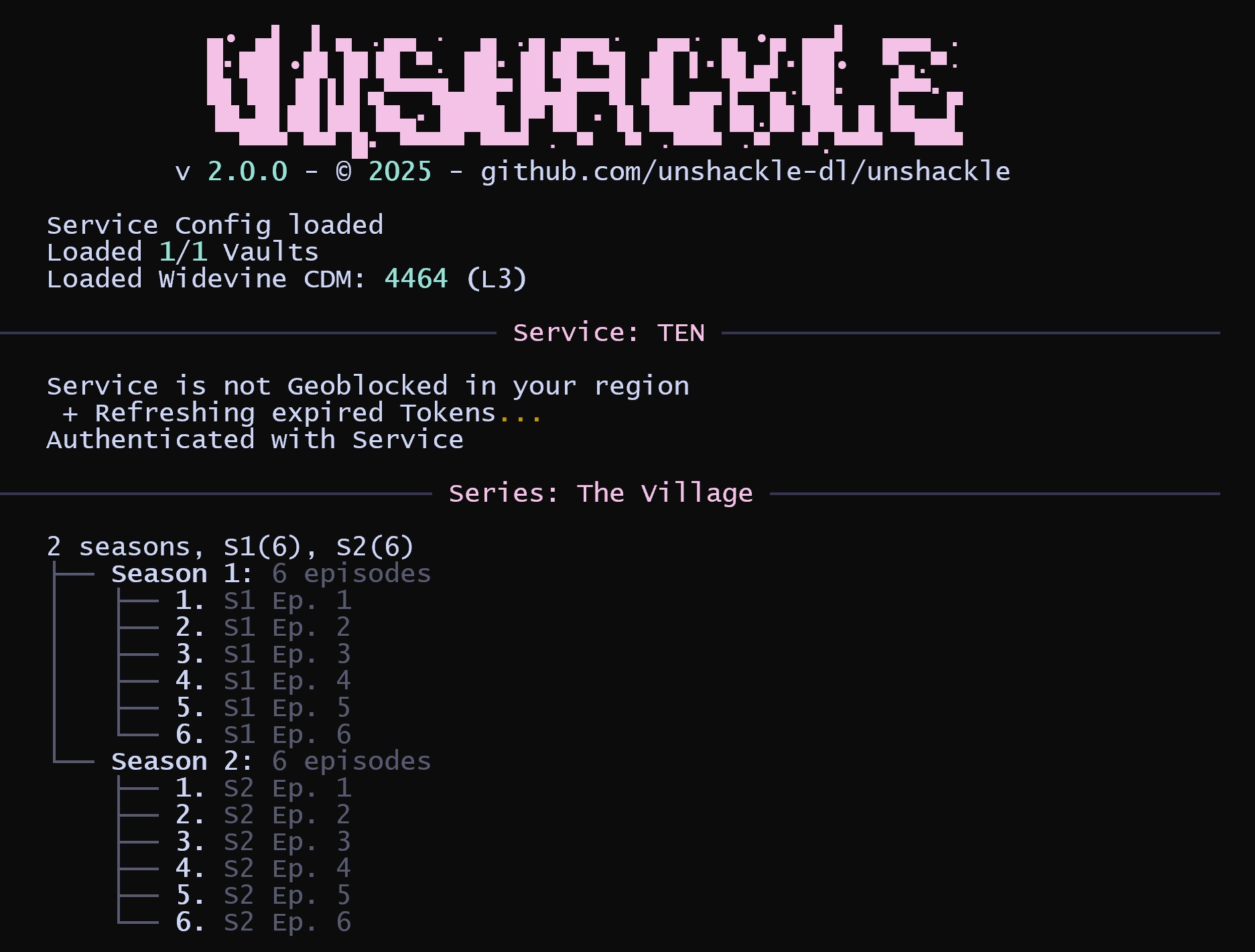 C:\unshackle>uv run unshackle dl --list-titles TEN https://10.com.au/the-village