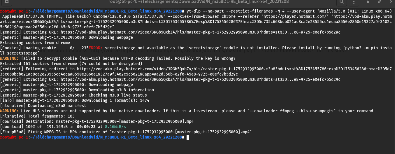 Code:yt-dlp --no-part --restrict-filenames -N 4 --user-agent "Mozilla/5.0 (X11; Linux x86_64; rv:141.0) Gecko/20100101 Firefox/141.0" --cookies-from-browser firefox --referer "https://player.hotmart.com/" "https://vod-akm.play.hotmart.com/video/3RGb5QxbZ4/hls/master-pkg-t-1752932995000.m3u8?hdnts=st%3D1753422230%7Eexp%3D1753422730%7Ehmac%3D233bfcef555c6c1c40963052c85a5f8b1e635d2fef9e527a1681152ee4f65525&app=aa2d356b-e2f0-45e8-9725-e0efc7b5d29c"