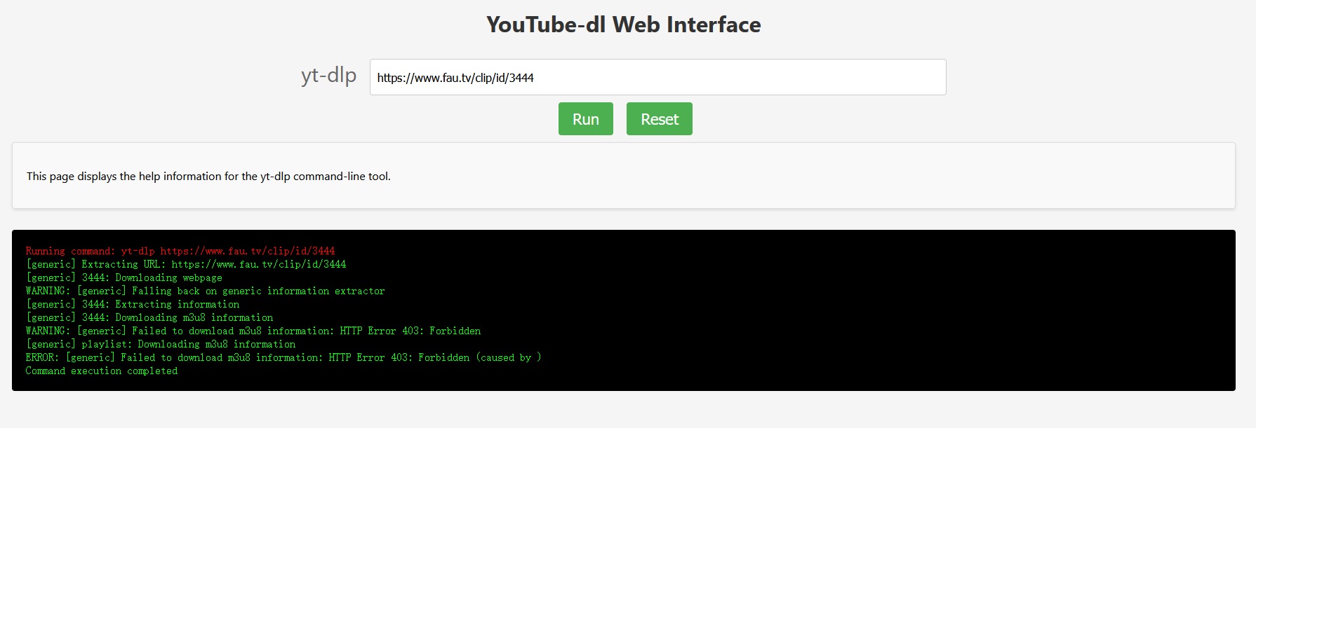 I tried to run the command „yt-dlp https://www.fau.tv/clip/id/3444“ at https://ytdlp.online/ytdlp-help.html but it failed. The same command is OK with local yt-dlp. Why?