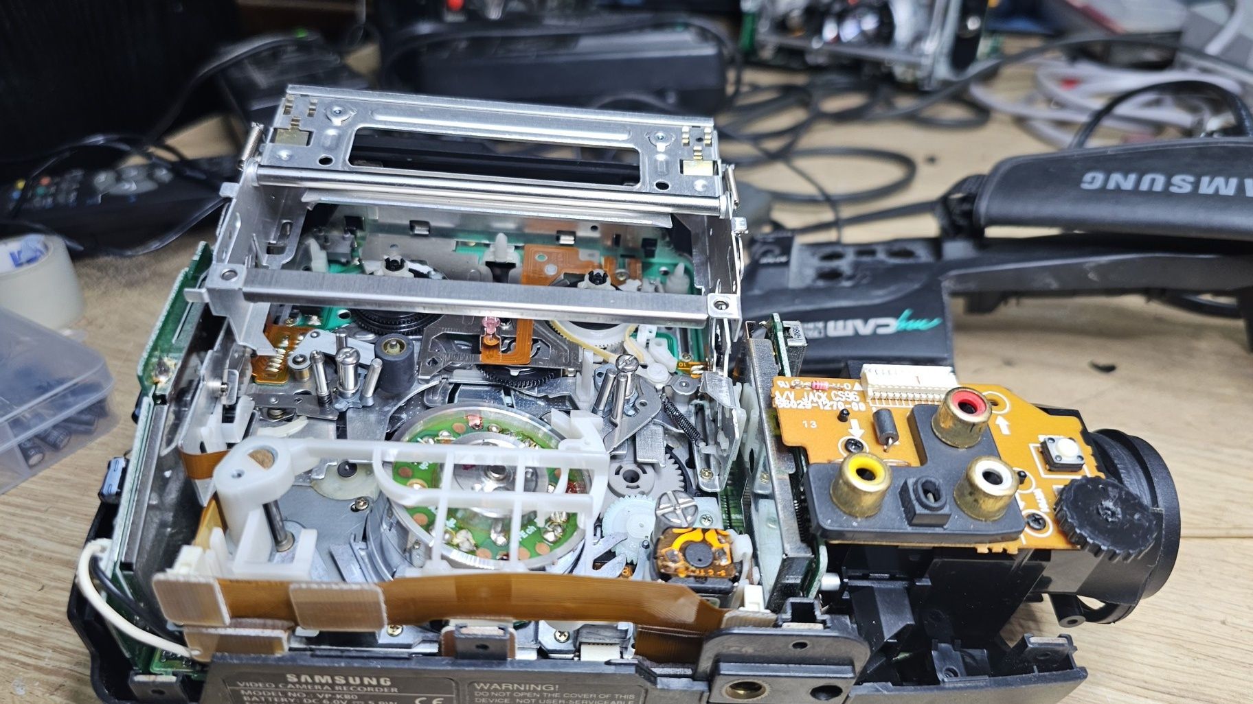 "Okay guys, Hey guys. I've been recapping this Samsung VP-K80 camera. The problem remains the same before or after recapping; it keeps ejecting the carriage with or without tape. The fault code displayed is L.EMG, and I cannot find what this error means. Thanks for the help; the problem is now solved, and I have a happy camcorder again. It turned out to be a tear in the ribbon connector junction at the bottom of the camcorder, affecting some sensors, etc. It was a bit hard to rewire, but it's working. The recapping was also a success."