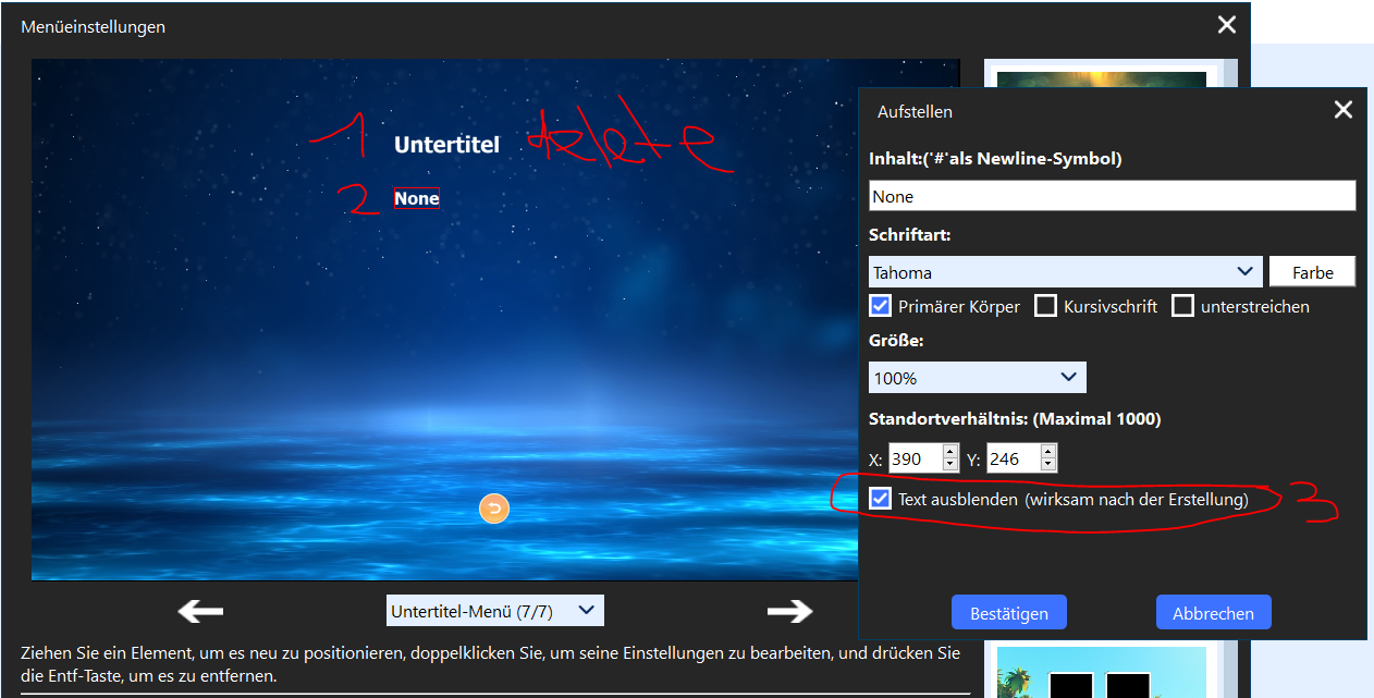 In the Subtitles submenu, the title Subtitles can be deleted. Double-click on the subtitle itself, select None, and then check the Hide box at the bottom.
