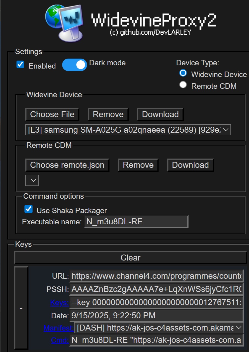 I'm downloading from Channel 4 in Edge on Win10 in VirtualBox (Win7 host). I used WidevineProxy2 with the first CDM in https://forum.videohelp.com/threads/417425-Real-Device-L3-Cdms. First, I ran the N_m3u8DL-RE command from WidevineProxy2 followed by, which created a 0 KB file. Next, I changed format=mkv to format=mp4 in the N_m3u8DL-RE command and ran mp4decrypt, which created a file the same size as the encrypted file. When I play it in WMP or VLC, it's scrambled..\mp4decrypt --key 00000000000000000000000012743272:80e6b93ac609c4d09 64b40b1f8080141 stream_2025-09-12_18-03-37.mkv countdown.mp4