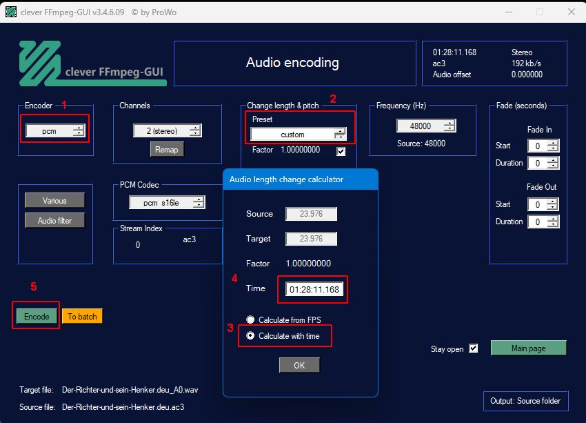 Then I used 1) to convert the ac3 file losslessly into a pcm (wav) file, adjusting the length, and inserted the new wav file into 2).