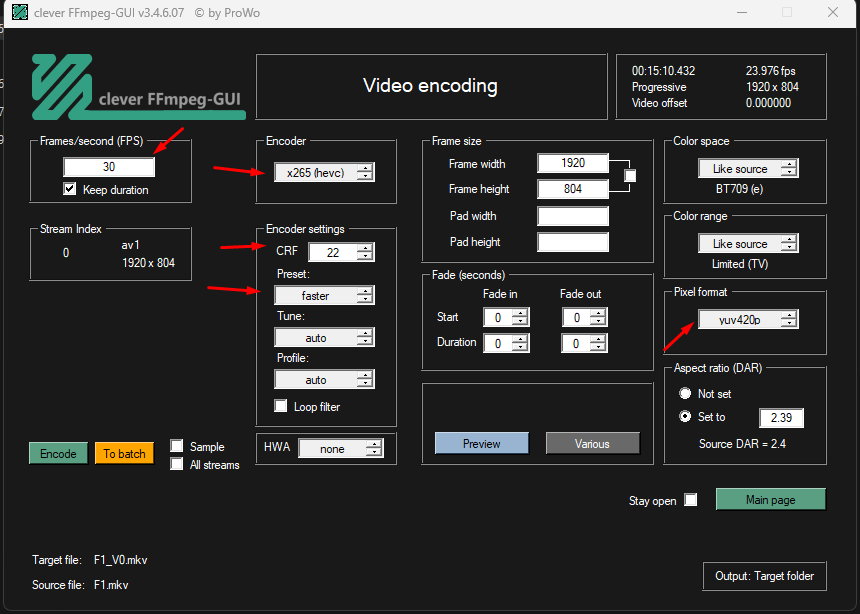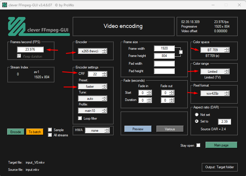 Kindly tell about the frame rate. My source video is 2.40.1 and the gui forces to 2.39 and does the gui uses all the threads for CPU encoding : -threads 0