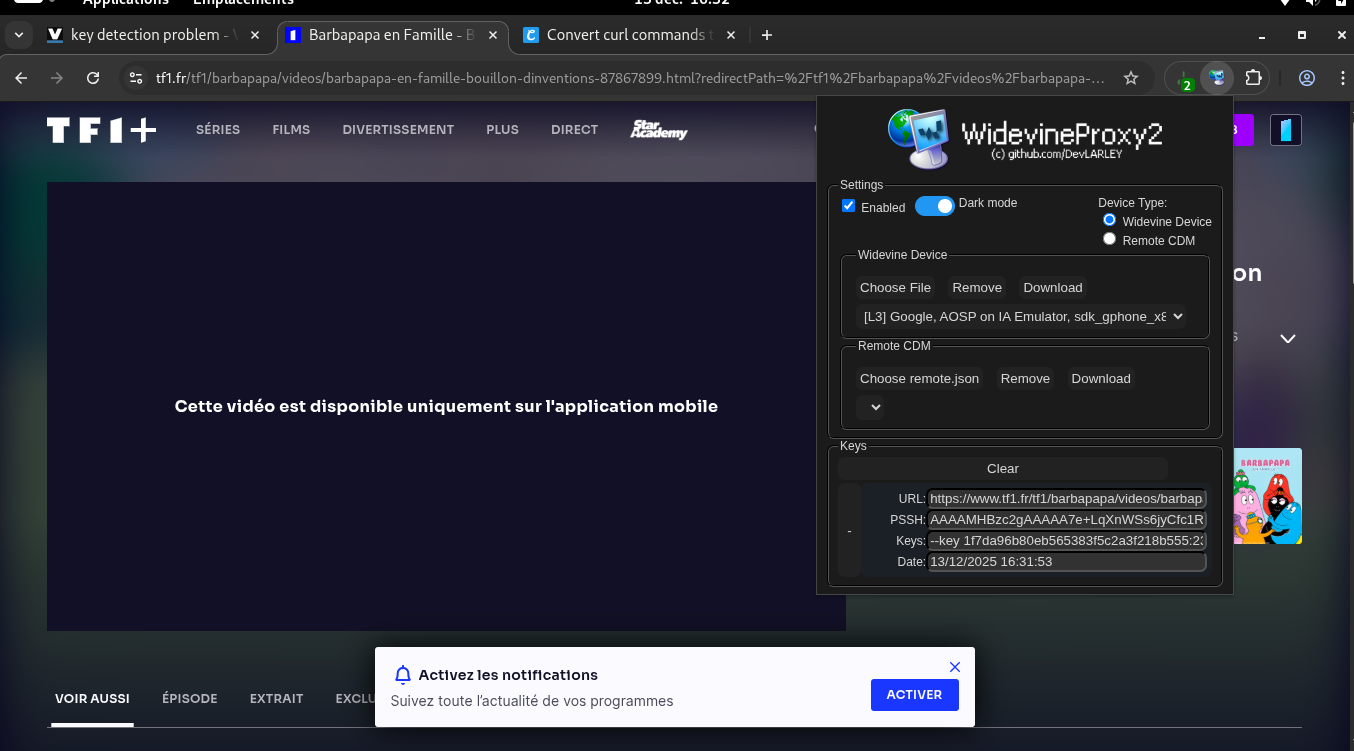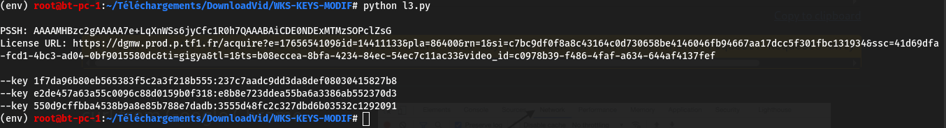 1. hello everyone, I would like to know how to do it manually to obtain the 3 key id:key of the video because since mpd, I obtained only one key id. I would like to know how to obtain the 3 keys like widevine decryptor?