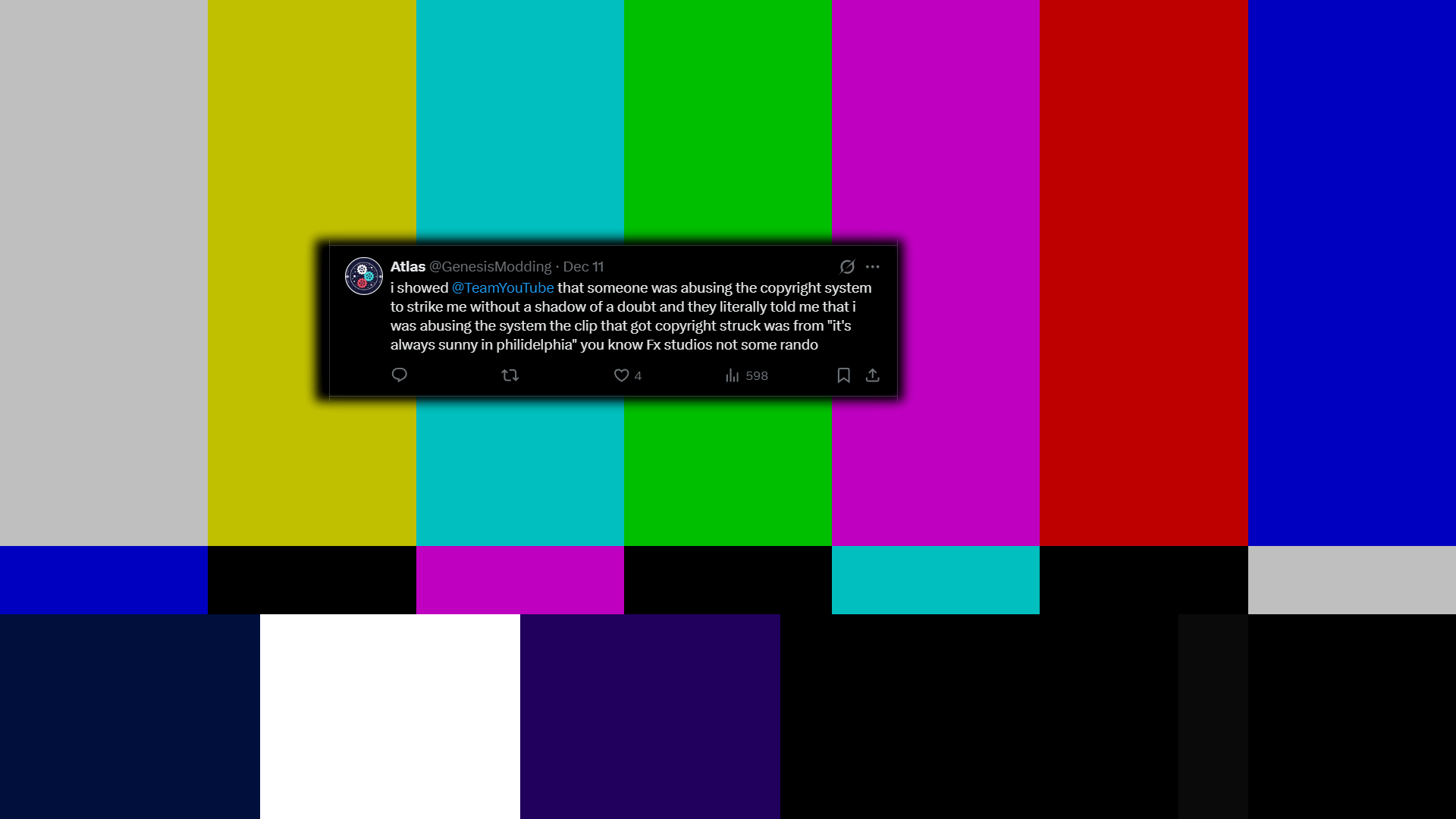 The script first creates a background video on which to overlay the tweet image. You would load your source video instead.Code:background = ColorBars(width=1920, height=1080, pixel_type="YV24") # make a background image ovr = ImageSource("image.png", start=0, end=23, fps=23.976).AddBorders(16,16,16,16).ConvertToYV24() amask = ovr.ColorYUV(off_y=256, cont_y=-256, cont_v=-256).Crop(16,16,-16,-16).AddBorders(16,16,16,16,color=color_black).BinomialBlur(50).ColorYUV(cont_y=40) Overlay(background, ovr, x=400, y=300, mask=amask) # overlay the image with
