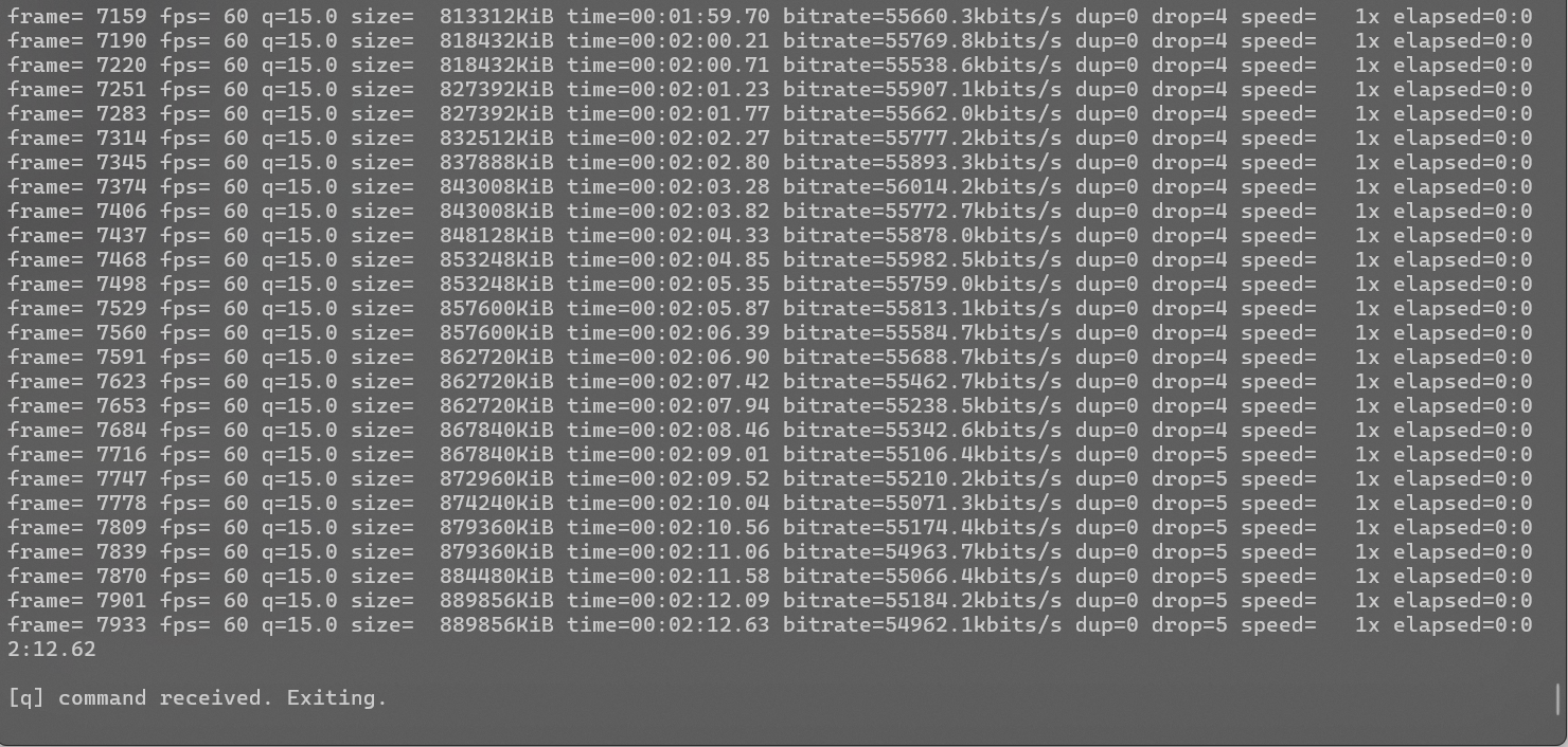 specs:Code:ffmpeg -hide_banner -rtbufsize 2G -f dshow -video_size 2560x1440 -framerate 59.9402 -pix_fmt bgr24 -video_pin_name 0 -audio_pin_name 2 -vsync 0 -fflags +genpts -i video="AVerMedia HD Capture GC573 1":audio="AVerMedia HD Capture GC573 1" -colorspace:v "bt709" -color_primaries:v "bt709" -color_trc:v "bt709" -color_range:v "tv" -c:v hevc_nvenc -pix_fmt yuv444p -gpu any -g 30 -rc vbr -cq 16 -qmin 16 -qmax 16 -b:v 0K -b_ref_mode 1 -spatial_aq 1 -temporal_aq 1 -aq-strength 15 -sc_threshold 40 -bf 2 -b_ref_mode each -i_qfactor 0.75 -b_qfactor 1.1 -refs 3 -keyint_min 25 -qcomp 0.6 -qblur 0.5 -surfaces 64 -preset p1 -profile rext -c:a copy -f segment -segment_time 9999999999 -strftime 1 -metadata DEVICE="AVerMedia Live Gamer 4K" -metadata:s:v:0 title="Game Video [AVerMedia Live Gamer 4K]" -metadata:s:a:0 title="Game Audio [AVerMedia Live Gamer 4K]" -metadata:s:a:1 title="Mic Audio" "F:\ffmpeg recordings\%%Y-%%m-%%d_%%H-%%M-%%S.mkv"
