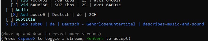 19:09:46.058 INFO : Sub subs0 | de | Deutsch - Gehörlosenuntertitel | describes-music-and-sound | 2733 Segments |