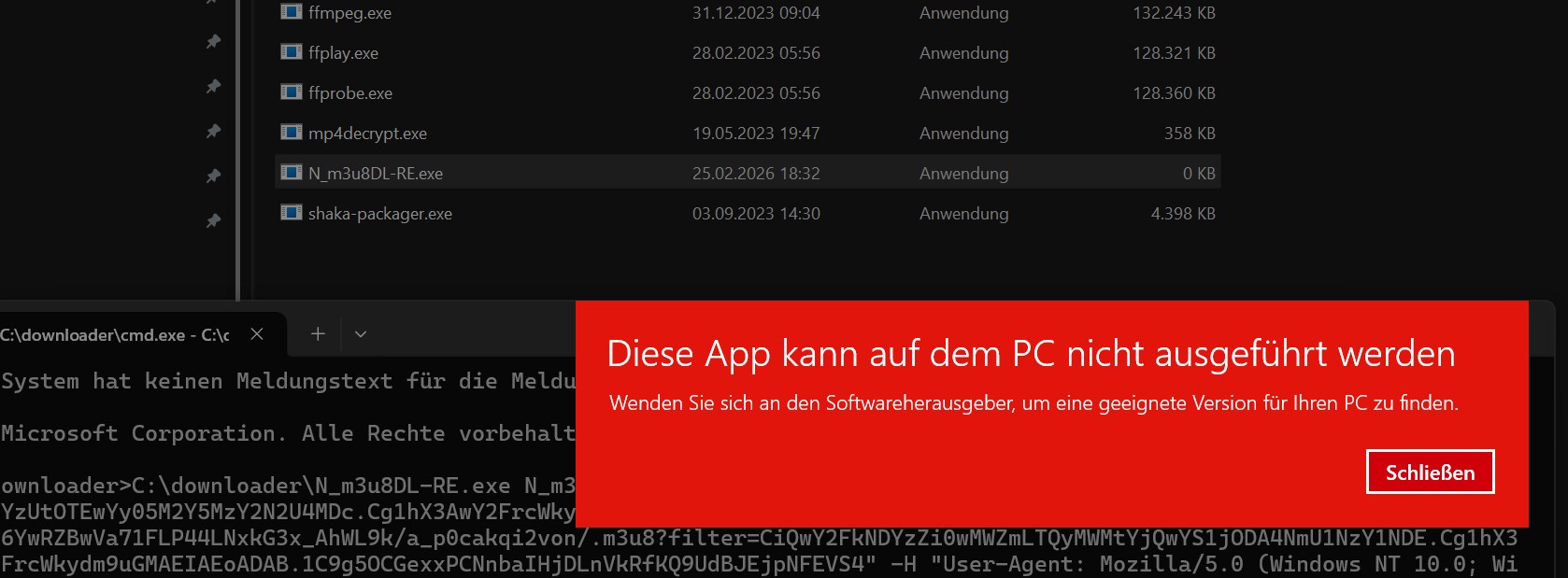 I installed N_m3u8DL-RE on my PC and added it to the system environment variables. Then I copied the URL into the CMD, but I got some errors. See below: