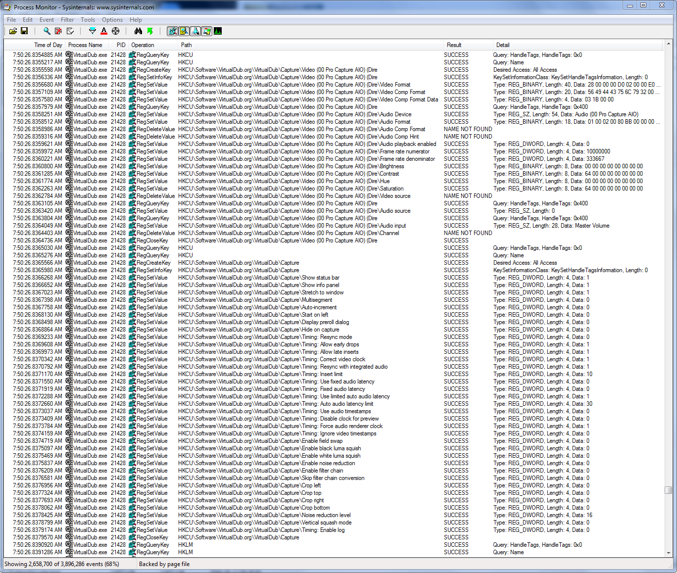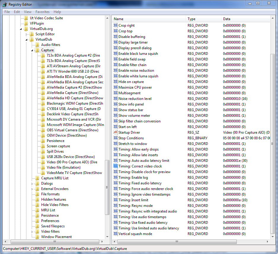 I use VirtualDub 1.9.11 for analog capture on Windows 7. I just noticed that my Timing settings revert to defaults constantly. I read that one can use the "Save current settings as default" command but that option is missing from my Capture menu.